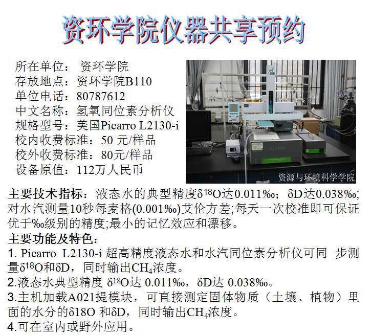 资环新葡京 的大型仪器氢氧同位素分析仪已添加到新葡京 贵重精密仪器共享预约系统,现在可在网上预约后使用仪器。欢迎校内外老师及同学们预约使用。